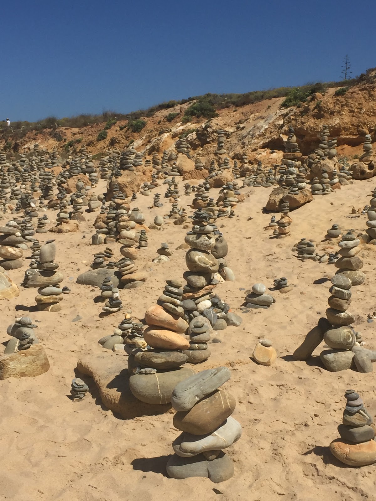 E foi nesta última que me deparei com as pedras empilhadas. Não sei quem começou, mas são às centenas, e acho que todos os dias alguém empilha mais algumas. Nós não fomos exceção. Vi pela primeira vez na Madeira, numa zona de caminhada. Agora estão junto ao mar. Significará equilíbrio emocional? Quem souber o significado, diga-me.