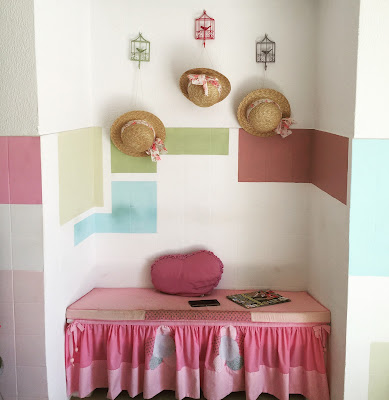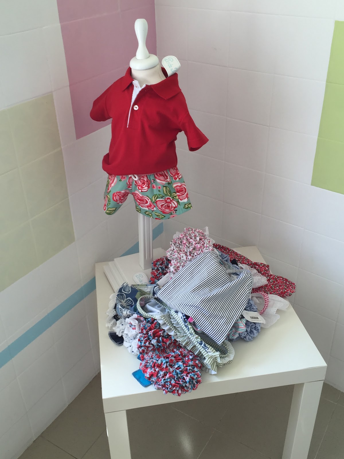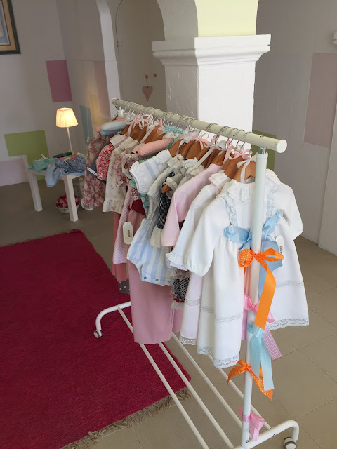 Tinha sido um bar, estava fechada há nove anos. A dona, que é da vila, resolveu restaurar o espaço, dar-lhe um ar mimoso e chamar-lhe Marias. Perguntei-lhe o porquê do nome, respondeu que tinha duas filhas de nome Maria, e assim ficou. Uma com onze e outra com oito. Acho que ficou com vontade de ter mais, digo eu. Os móveis são de família e restaurados. Paredes brancas com algumas pinceladas de cores suaves, o que lhe dá alguma graça. Não tem muita coisa, mas o que tem é super fofinho. Vestidos com folhinhos e laços, calções e fatos de banho com padrões amorosos, laços, camisolinhas com gola, botinhas e meias.