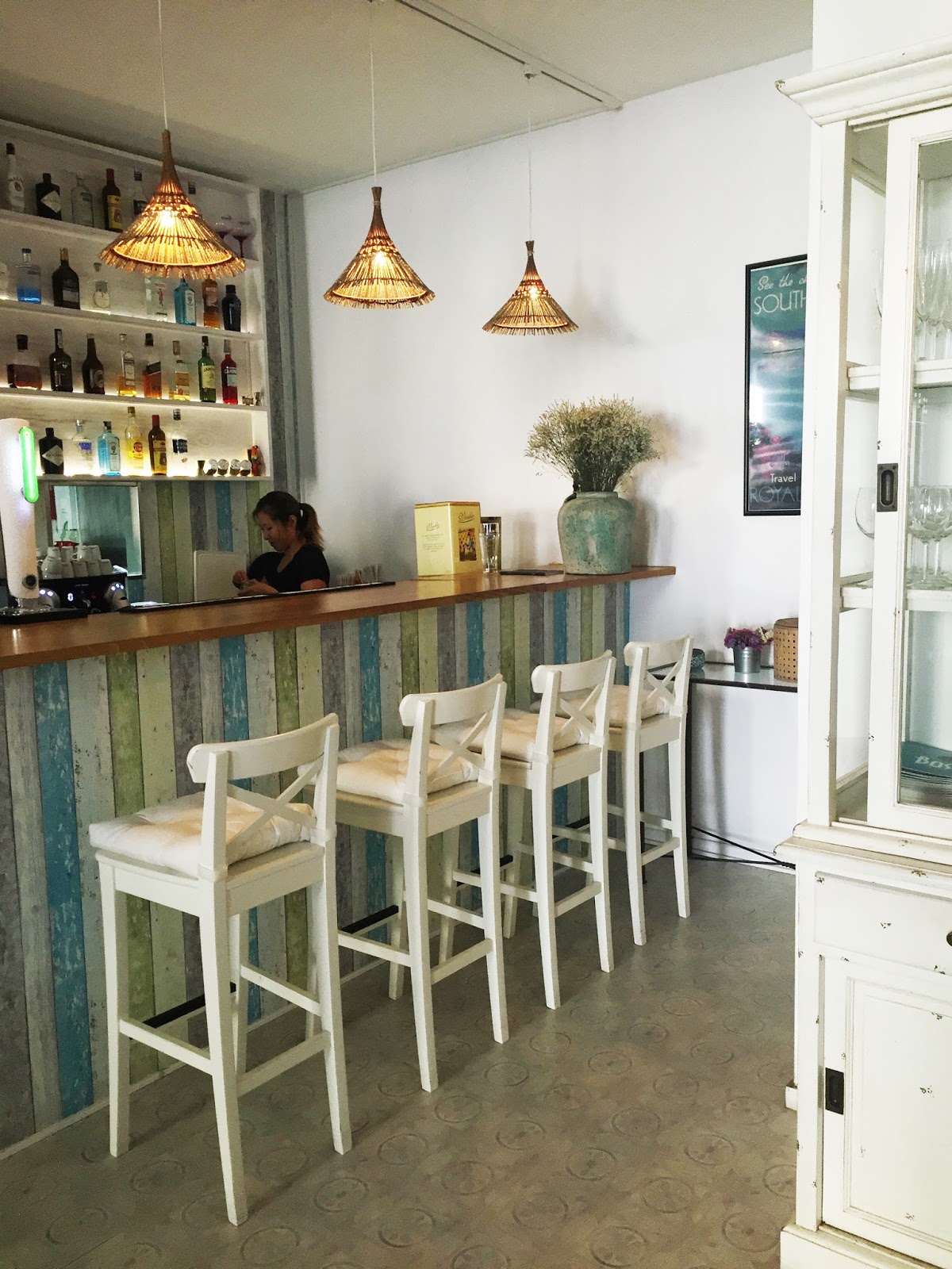 Mesmo sem ninguém, lá entrámos e fomos muito bem recebidos. A decoração é alegre, as mesas são pintadas de azul, com cadeiras de verga, os quadros muito anos 50, as almofadas coloridas dão um ambiente muito agradável e uma parte da parede, onde se localiza a cozinha e o bar, é pintada em tons de azul, branco e verde.
